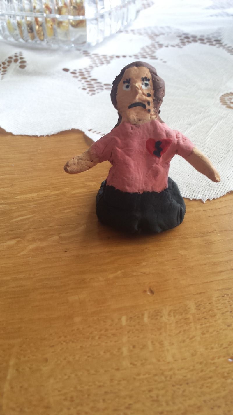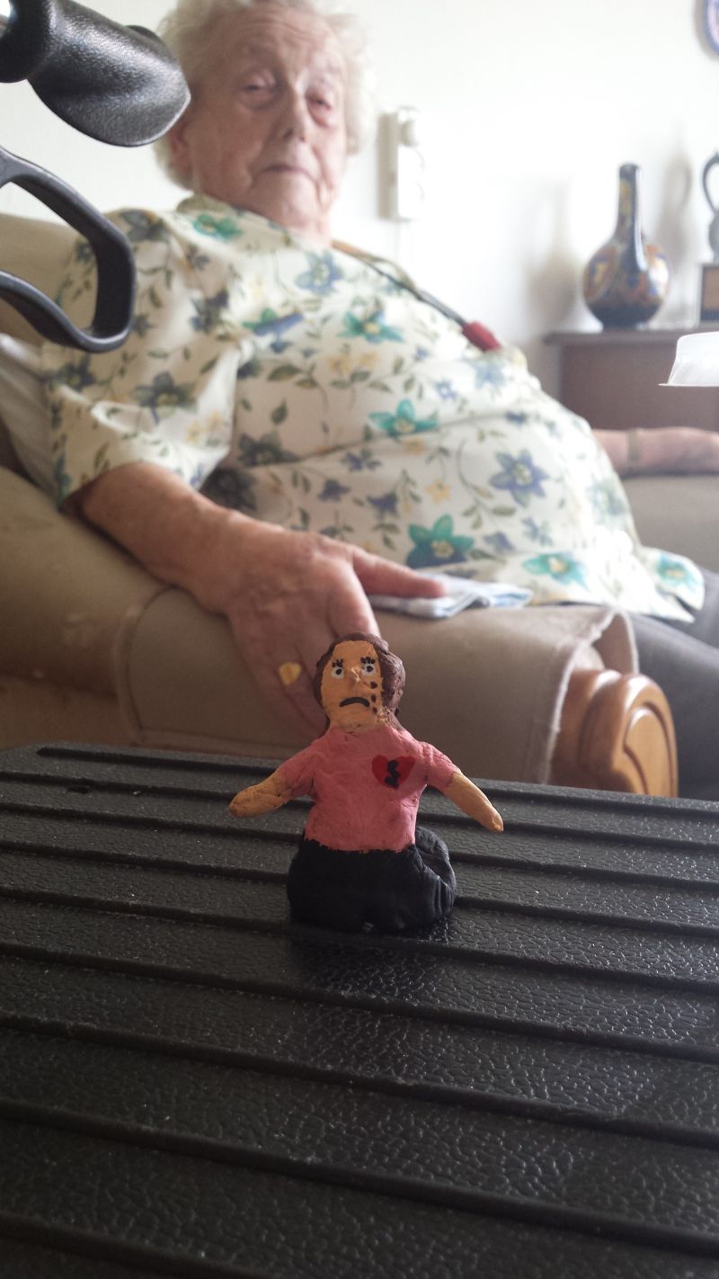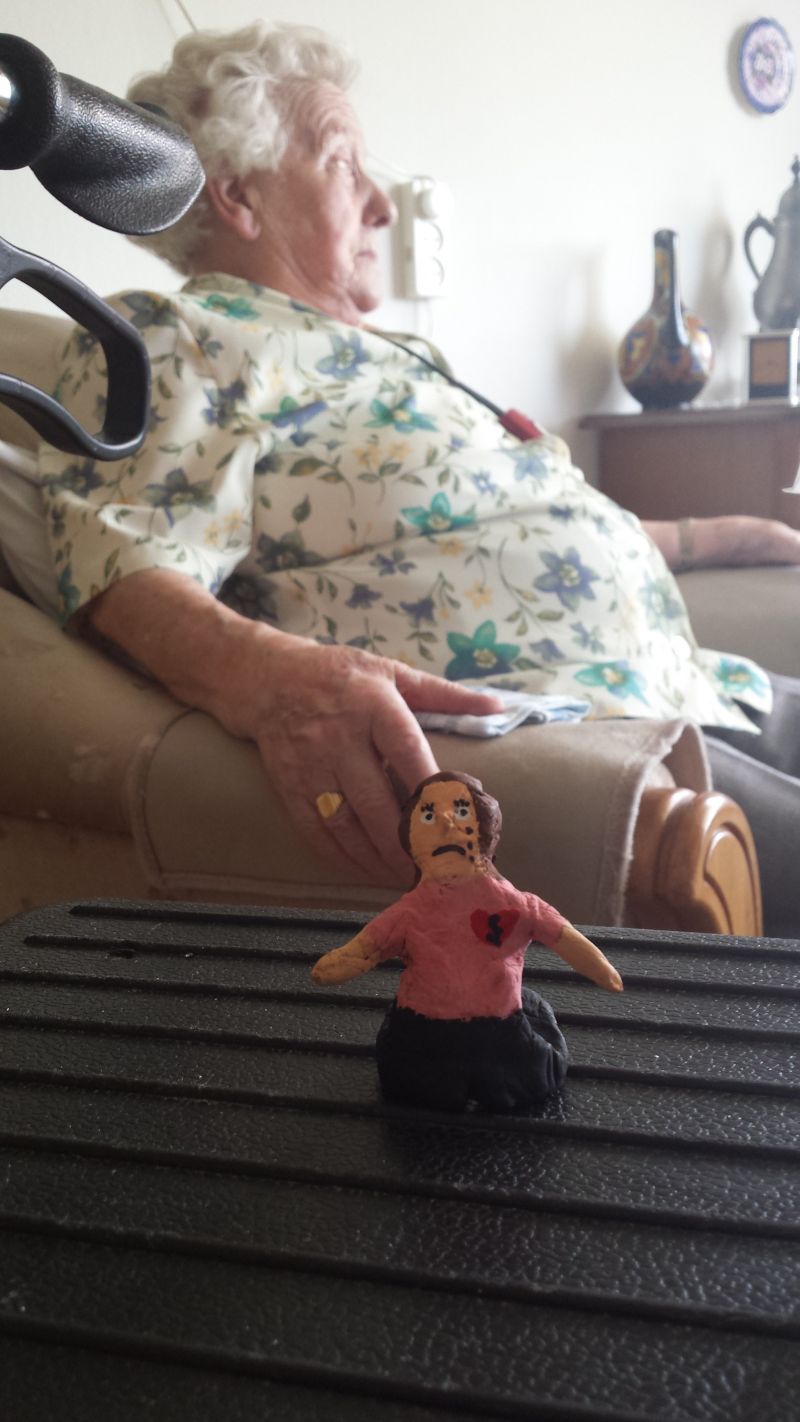Mijn poppetje huilt, omdat er jammer genoeg eenzaamheid ontstaat. Eenzaamheid vooral onder oudere mensen. Dit is niet mijn eigen oma, dit is mijn geadopteerde oma. Ik zit namelijk in een project genaamd Omalief en dat is een project waarbij jongeren elke week op bezoek gaan naar een opa of oma. Elke week naar de zelfde eenzame opa of oma om de banden te versterken en om de eenzaamheid te bestrijden.